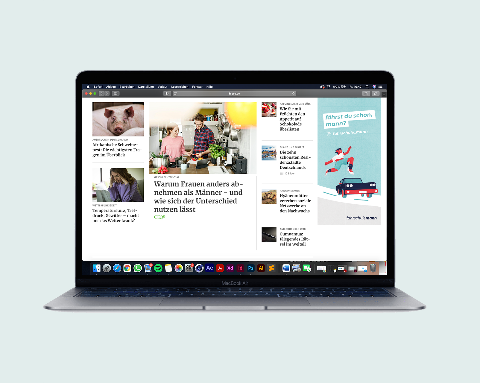 Während meiner Bachelorarbeit setzte ich mich mit dem Markenrelaunch der Fahrschule Mann auseinander. Eine besondere Herausforderung war trotz bestehenden Namings einer Diskriminierung entgegenzuwirken und in der Realisierung gleichermaßen eine höchstmöglich flexible Gestaltung für die verschiedenen Produkte zu entwickeln. Viele Fahrschuldesigns sind bereits veraltet und bedürfen einer Zielgruppenorientierteren, moderneren Anmutung. Durch ein dynamisches Konzept, welches sich flexibel anpassen lässt, kann sich die Marke nun auf den verschiedensten digitalen Kanälen etablieren und in Alleinstellung gegenüber der Konkurrenz hervorstechen.